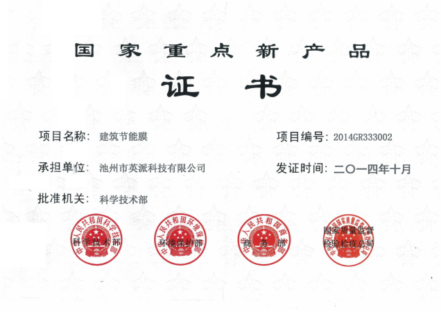 ENP汉膜建筑玻璃隔热节能膜,该材料为我国自主知识产权产品,发明人陈建峰教授曾任北京化工大学党委常委、副校长,2018年6月担任中国工程院秘书长。该产品是目前国家住建部推广的唯一一款玻璃隔热节能膜产品,获得安徽、江苏、湖南、重庆等省推广证书。