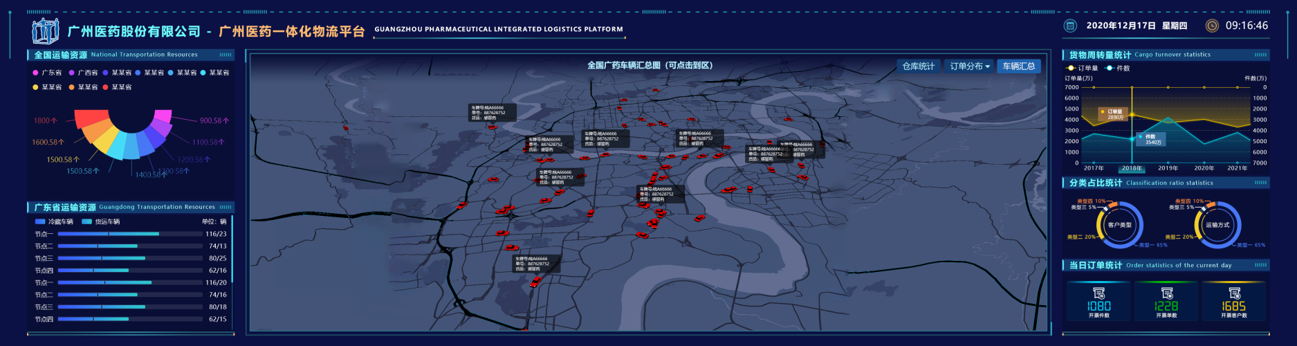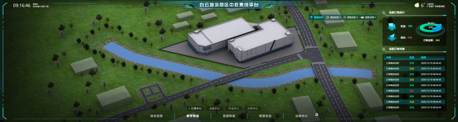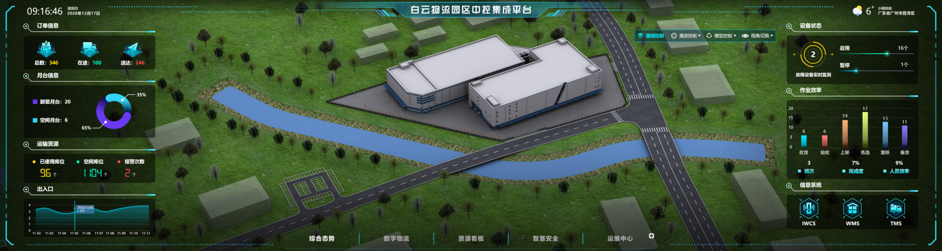 此项目是广药生物医药城白云园区物流项目(一期)弱电系统项目的定制开发,系统通过公司自己研发的SmartBuilding智慧建筑管理平台作为支撑,实现三维可视化的管理。平台集成业务报表系统、智能仓储控制系统、物流运输管理系统、仓储管理系统、物流配送系统、物流作业系统、信息发布系统、视频监控系统、周界报警系统、巡检系统、门禁系统、车辆闸机等系统。以BIM三维模型为依托,通过数字孪生技术,将全景业务、园区安全、物流运营、资源看板等板块的传统形式与三位模型智慧结合,实现集中展示、集约管理、信使联动的智慧平台。
