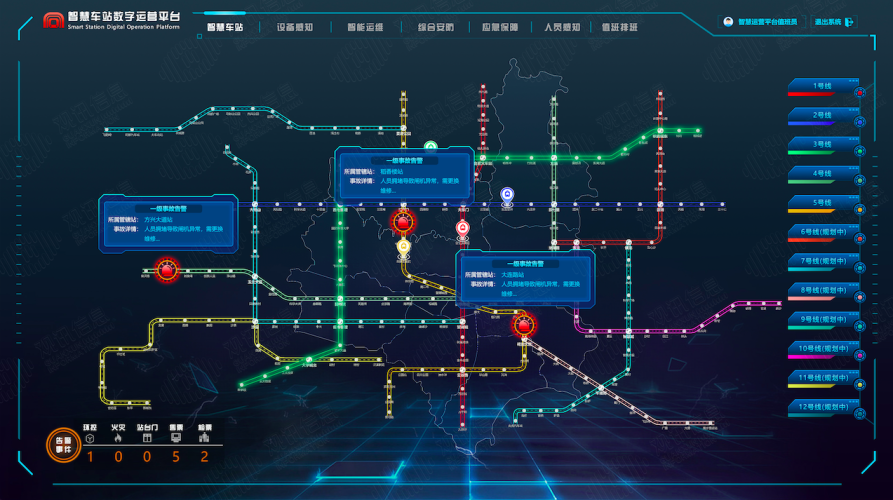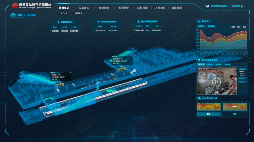 以观讯信息自主研发的智慧车站三维综合管理平台,以车站的BIM和GIS三维数据作为基础数据,与车站的各为联网数据进行基础,实现三维可视化的动态管理。主要集成了视频监控系统、安检系统、AFC系统、电梯控制系统、门禁系统、智慧消防系统、智能环控系统、能耗分析等系统。实现车站运营对设备、环境、能耗、客人、安检的实时监测。
