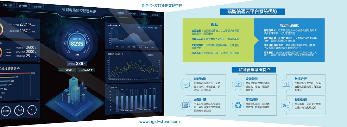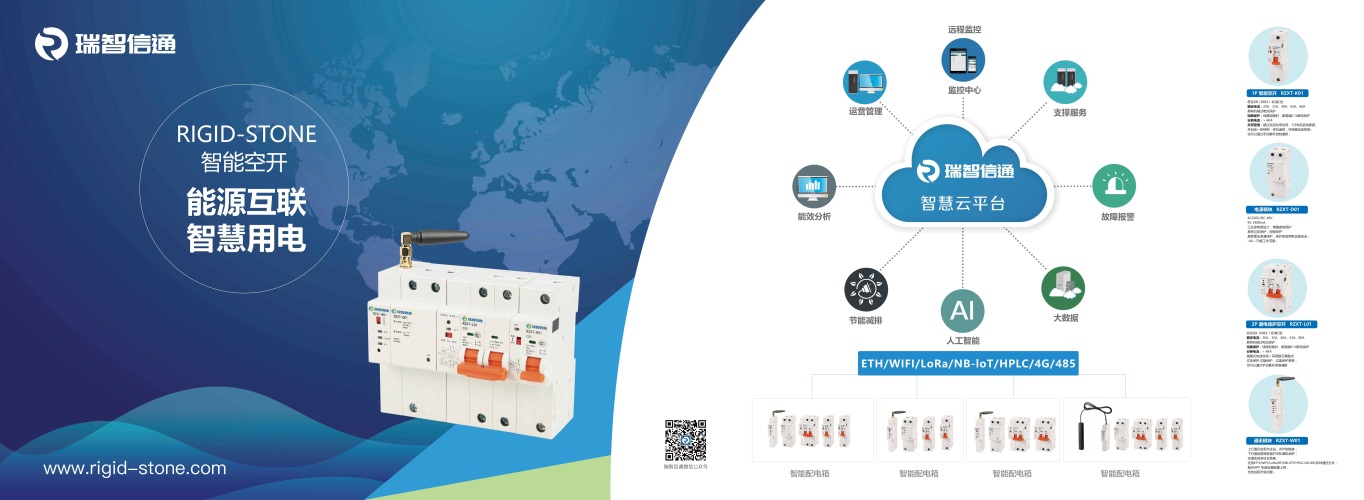 智慧空开RZXT-D01、RZXT-D02是深圳市瑞智信通科技有限公司(以下简称瑞智信通)自主研发的一款用于智慧用电安全监管和电能管理的开关产品.产品具有短路、过流、过压、欠压、过温保护和漏保功能,故障显示、自检、功率限定、计量、合闸分闸控制、开关定时、告警等功能,通过RJ45有线和WIFI、NB-IOT、LoRa、HPLC、4G、485多种通讯方式与监控主站通讯,在监控主站进行统一数据查询、管理控制,为用电安全监管提供科学的决策依据,达到智慧用电管理的目的。