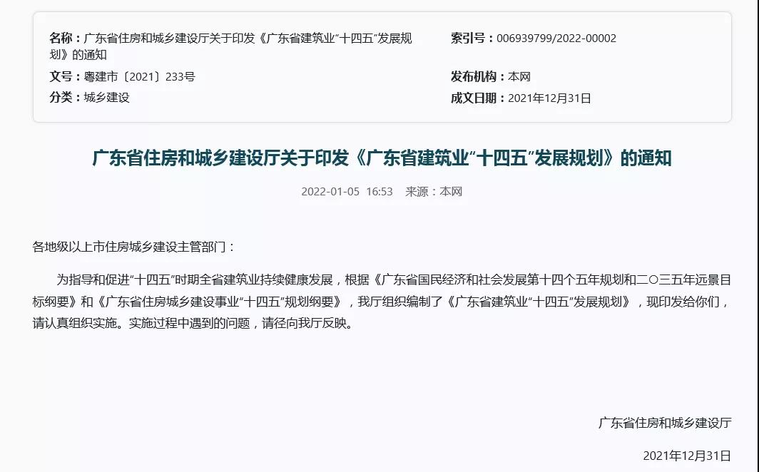 “十四五”时期是我省奋力在全面建设社会主义现代化国家新征程中走在全国前列、创造新的辉煌的起步阶段,也是我省由“建筑业大省”迈向“建筑业强省”的关键时期。建筑业作为国民经济的支柱产业,能够为构建以国内大循环为主体、国内国际双循环相互促进的新发展格局提供有力支撑。根据《广东省国民经济和社会发展第十四个五年规划和二○三五年远景目标纲要》《广东省住房城乡建设事业“十四五”规划纲要》等要求,特编制《广东省建筑业“十四五”发展规划》。规划全面回顾“十三五”期间全省建筑业发展的主要成就和存在问题,深刻分析新时期的机遇和挑战,提出“十四五”时期全省建筑业发展的总体要求、发展目标、主要任务和行动举措,是全省建筑业高质量发展的纲领性、指导性规划。
