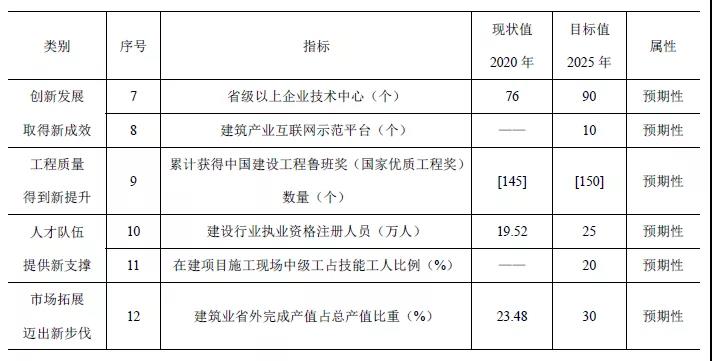 创新发展取得新成效。建筑技术研发投入力度不断加大,累计创建省级及以上技术中心达到90家以上,培育不少于10个建筑产业互联网示范平台。
