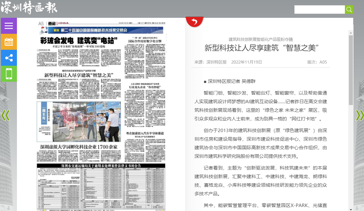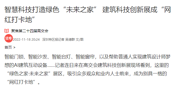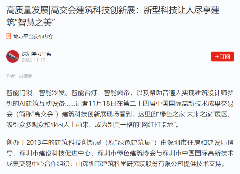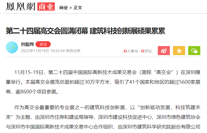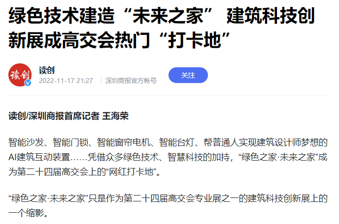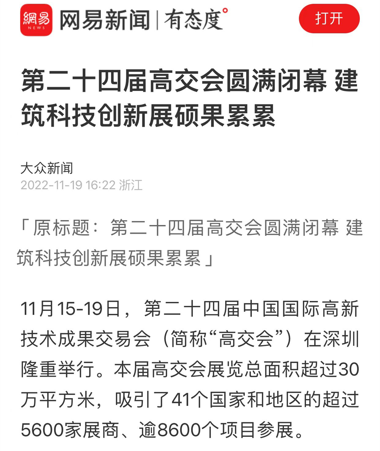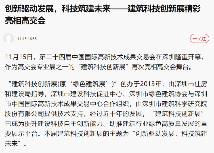 在本届高交会上,“建筑科技创新展”凭借众多创新建筑科技产品和技术,成为大会一道靓丽的风景线。光明日报、“学习强国”平台、第一财经、深圳特区报、深圳商报、晶报等主流媒体,新浪网、凤凰网、网易新闻、中国日报网、读特新闻等门户网站及骏绿网等行业媒体纷纷对“建筑科技创新展”进行报道,引发社会关注。