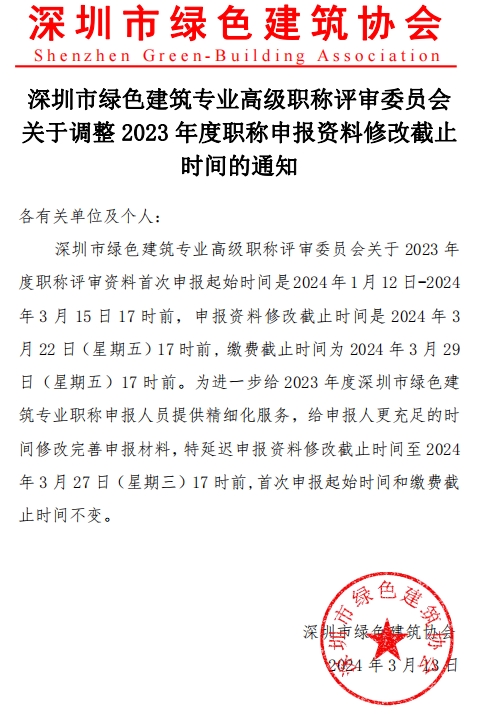深圳市绿色建筑专业高级职称评审委员会关于调整2023年度职称申报资料修改截止时间的通知