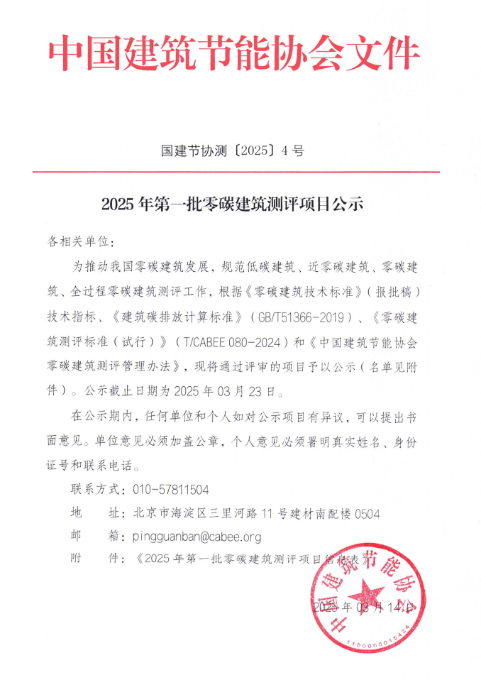 2025年3月14日,中国建筑节能协会印发《2025年第一批零碳建筑测评项目公示》,公示截止日期为2025年3月23日。由云博国际网站开展测评工作的7个广东省零碳建筑测评项目通过公示,顺利取得标识证书。
